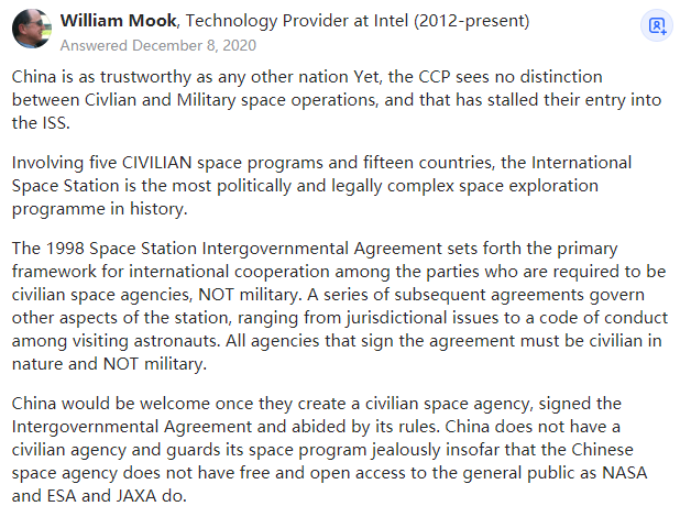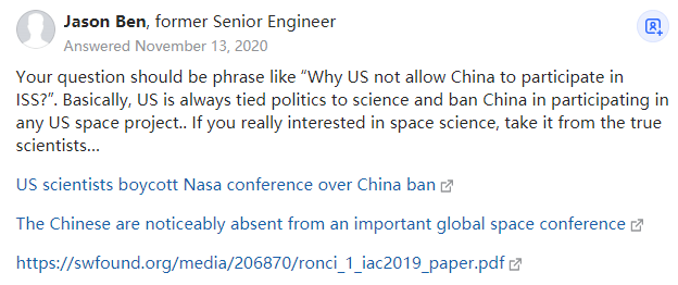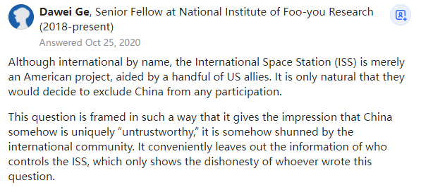 Senior Fellow at National Institute of Foo-you Research (2018-present)国际空间站(ISS)虽然名称上是国际性的,但它仅仅是美国的一个得到了少数几个美国盟友的帮助的项目,它们决定将中国排除在参与之外是很自然的。