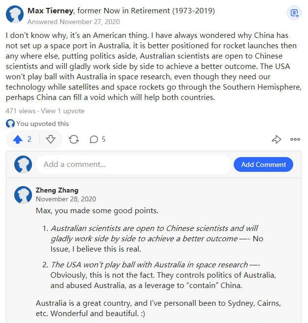 我们确实会考虑美国的政治,是幸运还是不幸取决于一个人如何看待这一点。对我来说,我不在乎,特朗普已经非常明确地表示他不喜欢我们(因为我们在上世纪80年代曾向他明确表示他人品不行,不能在澳大利亚拥有赌场)。抛开政治不谈,中国和澳大利亚在昆士兰州北部拥有一个共同的太空基地是合理的,这里靠近赤道,几百公里内居民非常少,中国和澳大利亚拥有的专业知识将比所有其他国家都要多,我想日本也有机会加入,所以我们可能是三个在错误的半球做伟大的事情的国家!