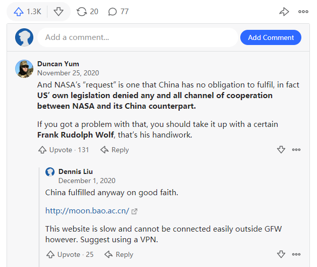 如果你对此有意见,你应该找一个叫弗兰克·鲁道夫·沃尔夫(Frank Rudolph Wolf)的人谈谈,那是他的杰作。译注:沃尔夫条款是美国众议院拨款委员会商业、司法、科学及相关机构小组委员会主席弗兰克·鲁道夫·沃尔夫提出的一项禁止美中两国之间任何与美国航天局有关或由白宫科技政策办公室协调的联合科研活动的条款。这个网站打开速度很慢,在墙外无法轻松连接,建议使用VPN。中国宇航局应该有这样一个政策:我们愿意与所有人合作,但优先考虑关系密切的联盟/伙伴以及友好的国家和机构。