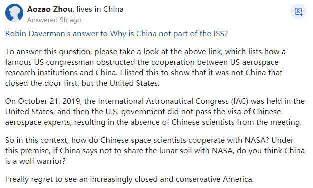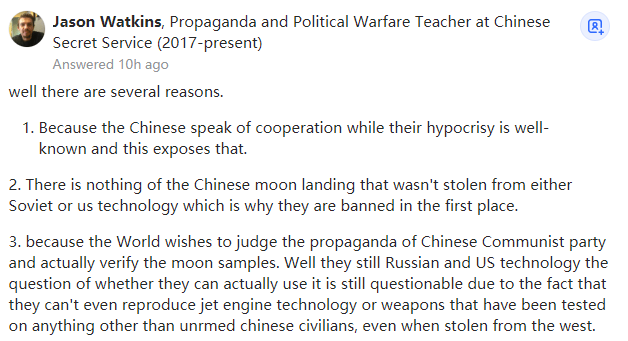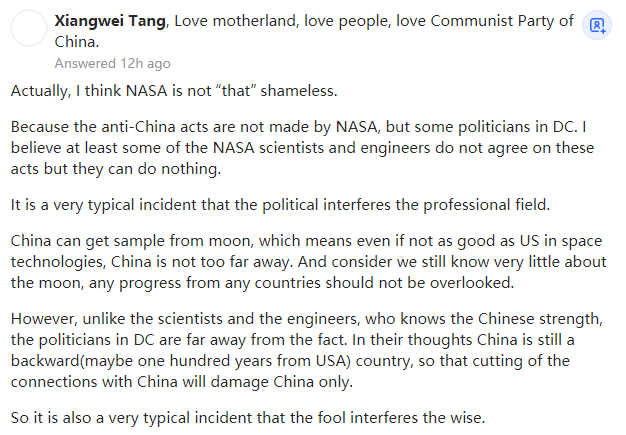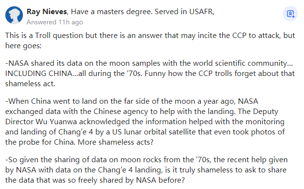 我同意你的看法,Ray,这是个引战的问题。然而,它成功地达到了它的目的,得到你的回应。你的反应和它们预期的一样,与以美国为首的西方对中国的诽谤和诬陷相比,一个引战问题的危害要小得多。我相信NASA的科学家们真的希望把中国纳入科学交流,但事实是尽管美国在冷战期间为NASA与俄罗斯的合作开了绿灯,但美国还是指示NASA将中国排除在外。“无耻”一词应该指向美国政府,在将中国排除在外50年后,现在它们又允许NASA向中国伸手要求月球土壤样本。