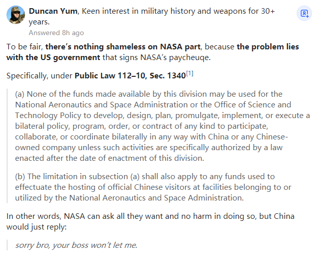 具体而言,根据《公共法案》第1340章,第112–10节(a) 本部门提供的资金不得用于NASA或科学技术政策办公室制定、设计、计划、颁布、实施或执行任何形式的双边政策、计划、命令或合同,不得参与、合作或协调任何与中国或任何中资公司合作,除非此类活动由有法律的明确授权。(b) (a)款的限制也适用于在属于NASA或由NASA使用的设施接待中国官方访客的任何资金。换言之,NASA可以问他们想问的所有问题,但中国只会回答: