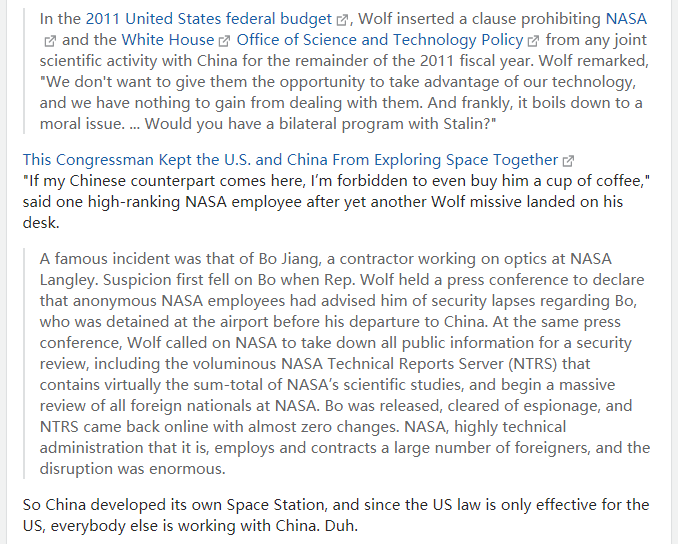 中国希望成为国际空间站的一部分并愿意为此付出和努力,但美国国会通过了一项禁止中国参与的法律。多亏了这位美国国会议员弗兰克·沃尔夫(Frank Wolf,政客),他称中国为“邪恶帝国”,并将阻止美中在任何议题(包括太空)上的合作视为一种职业。在2011年美国联邦预算案中,沃尔夫加入了一项条款,禁止NASA和白宫科技政策办公室在2011财年剩余时间内与中国开展任何联合科学活动。沃尔夫说:“我们不想让他们有机会利用我们的技术,我们与他们打交道没有任何好处。坦白地说,这归根结底是一个道德问题....你愿意和斯大林进行双边合作吗?”“如果我的中国同行来这里,我甚至被禁止给他买杯咖啡”,一位NASA的高级职员在另一封沃尔夫的公函落在他的办公桌上后说。一个著名的事件是江波事件(译注:NASA职员,2013年被FBI逮捕),他是一个在NASA兰利研究中心工作的研究员。当众议员沃尔夫召开记者招待会宣布NASA的匿名员工向他通报了有关江波的安全风险时,江波受到了怀疑,江波在前往中国之前被扣留在机场。在同一场记者招待会上,沃尔夫呼吁NASA将所有公开信息记录下来以便进行安全审查,其中包括几乎包含了所有NASA科学研究信息的技术报告服务器(NTRS),并开始对所有在NASA工作的外国人进行大规模的审查。江波后来因为没有从事间谍活动而被释放,技术报告服务器(NTRS)重新上线时几乎没有任何变化。NASA是一个技术含量很高的管理机构,雇佣和外聘了大量的外国人,这次审查造成了巨大的破坏。中国发展了自己的空间站,由于美国法律只对美国有效,因此其他国家都在与中国合作。他是任职时间最长的美国国会议员。除了反|华情结,他还... 支持布什总统参与伊拉克战争,投票支持将《爱国者法案》永久化,反对需要《外国情报监视法》授权才能在美国境内进行窃听,并支持总统限制国会对中情局审讯的监督。沃尔夫认为堕胎应该是非法的,他反对联邦雇员的节育补贴,沃尔夫也投票否决了对计划生育的资助。他还反对为发展中国家的国际计划生育项目提供资金。沃尔夫反对《就业不歧视法》,因为他担心它会破坏宗教自由。许多欧洲人认为小布什是美国向国际社会推出的最糟糕的美国人。哈哈!那你是没有见过沃尔夫!美国国会每两年就会出现的一群又一群的白痴,比如沃尔夫命令NASA彻查其在线公共图书馆并删除教科书,以免中国窃取公开信息.....这真让你真的无言以对(查理·博尔顿正在抹杀NASA的历史)。是的,他曾17次当选美国国会议员。