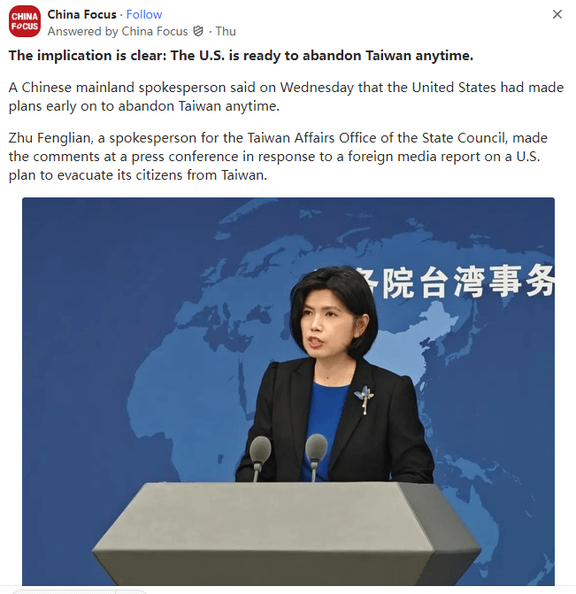 中国大陆发言人周三表示,美国早就制定了随时放弃台湾的计划。国务院台湾事务办公室发言人朱凤莲在记者招待会上回应了外国媒体关于美国计划从台湾撤离其公民的报道。朱说,一段时间以来,美国某些政客口头上说要促进台海和平与稳定,但实际上他们一直在挑衅并不断向台湾出售武器。她补充道,所谓的“撤离计划”向所有人表明美国只是将台湾作为遏制中国的棋子并将随时放弃台湾。