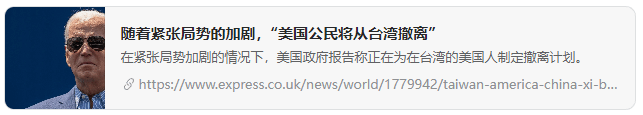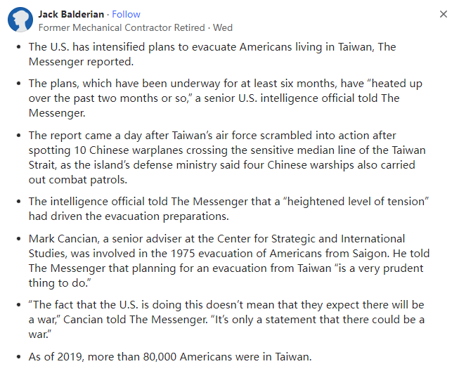 Ø这位情报官员告诉《信使报》,“紧张局势加剧”推动了撤离准备工作。Ø战略与国际研究中心的高级顾问Mark Cancian参与了1975年从西贡撤离美国人的行动,他告诉《信使报》,计划从台湾撤离“是一件非常谨慎的事情”。ØCancian告诉《信使报》:“美国这样做并不意味着它们预计会发生战争”,“这只是一种可能发生战争的声明”。