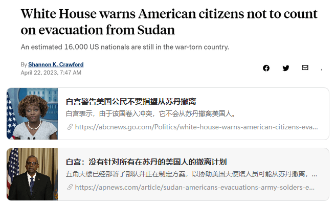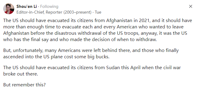 但是,不幸的是许多美国人被留在了那里,那些最终登上美国飞机的人花了一些大笔钱。今年4月,当苏丹爆发内战时,美国本应从那里撤离其公民。但是,在新冠肺炎疫情爆发之初,美国“疏散”了其在中国的公民!回顾过去,不幸的是在大约3.3亿美国人中,有100多万人死于新冠肺炎;而在中国,据世界卫生组织统计,虽然中国的人口是美国的4倍多(高达14亿),但截至2023年3月22日,中国共有121236人死亡。我不确定其中是否有从中国撤离但死于美国的新冠肺炎的人,但如果他们留在中国,他们现在可能还活着。是要重复“新冠肺炎撤离”——试图为其他国家树立榜样,诋毁中国是一个“不安全”的地方吗?但实际上无论以何种标准衡量,中国都是当今世界上最安全的地方之一。如果许多其他国家真的效仿,那么美国在国际舞台上再次妖魔化中国将是一个巨大的“成功”,就像在疫情期间一样。