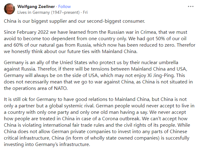 德国总理朔尔茨表示“我们不想与中国脱钩,但也不能过度依赖中国”,为什么他会这么说?本文译自Quora,原标题:Germany chancellor Scholz said "We don't want to decouple from China, but can’t be over reliant." What does he mean for Germany's ties with China?按照双方透露的行程,朔尔茨此访的时间不长,但却是一次“正式访问”,在当前动荡的世界格局大背景下,这场跨越欧亚大陆的访问,看点很多,颇受瞩目。就中德关系来说,中国上次接待德国总理到访还是在2019年9月,当时,时任德国总理默克尔进行了其任内第12次访华。二、这是中共二十大闭幕后首位访华的西方大国领导人。西方舆论将中共二十大称为“数十年来影响最大的”一次历史性会议,朔尔茨此访距离二十大闭幕不到两周,特殊的时点是外界观察此访的另一个视角。不得不说,朔尔茨此次访华,是在排除不少杂音干扰的背景下成行的。在冷战思维抬头和意识形态偏见的裹挟下,在一些西方国家,反华日益成为所谓的“政治正确”。有评论称,而在当前乌克兰危机持续、能源危机蔓延的欧洲,对华应该保持何种态度,可以说,朔尔茨的访华,本身就是一个强烈信号。大众、宝马、西门子、阿迪达斯、拜耳、德意志银行……这是中国民众熟知的德国品牌,也是德国媒体日前披露的随朔尔茨访华的经济界代表团成员。德国《商报》披露,这支商业代表团由12名德国企业高管组成,报道还称,申请加入代表团的约有100人。Lives in Germany (1947–present)自2022年2月以来,我们从俄罗斯在克里米亚的战争中吸取了教训,即我们必须避免过于依赖某一个国家。我们从俄罗斯获得了50%的石油和60%的天然气,现在已经降到了零。因此,我们在真诚地思考我们未来与中国的关系。德国是美国的盟友,美国通过对俄罗斯的核保护伞来保护我们。由于美国可能不喜欢中国,因此,如果中美关系紧张,德国将永远站在美国一边。但这并不一定意味着我们要对中国开战,因为中国不在北约的行动区内。德国与中国保持良好关系仍然是没问题的,但中国不仅是德国的合作伙伴,也是其在全球的系统性的竞争对手。德国人民永远不会接受生活在一个一党制国家,我们绝不接受在新冠病毒爆发的情况下人们在中国受到的待遇,我们也不能接受中国违反国际公平贸易规则和人民的权利。虽然中国不允许德国私营公司投资中国关键基础设施的任何部分,但中国(以国有独资公司的形式)正在成功投资德国的基础设施。从我们与韩国的贸易关系中,我们了解到,如果假设中国不再需要德国的技术,那么到2025年中国将在公平贸易方面变得更加严格。如果我们仍然像今天一样依赖中国的出口和进口,我们将被迫遵守中国的规则。因此,我们必须在全球其他地区(印度、印度尼西亚、菲律宾、泰国、巴西、加拿大等)实现更多的多元化。我认为中国和德国之间维持10%的对外贸易额是没问题的,因为德国不能忽视一个拥有14亿消费者的繁荣市场,我们也需要与中国在抗击全球变暖的斗争中合作。如果中国能够在乌克兰战争中发挥更具建设性的作用(尤其是作为联合国安理会常任理事国),我们将不胜感激。为了更加独立于美国(由于唐纳德·特朗普)和中国,欧盟必须在未来的外交、贸易和军事方面发挥更重要和独立的作用。