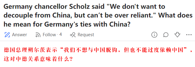来源:Germany chancellor Scholz said "We don't want to decouple from China, but can’t be over reliant." What does he mean for Germany's ties with China?