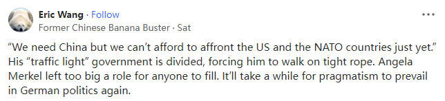 Kanthaswamy BalasubramaniamLawyer,Lives in Chennai, Tamil Nadu, India当奥拉夫·朔尔茨被迫访问中国时,这个笑容是中国赢得的一张巨大的面子。事实是,德国商业界已经告诉朔尔茨,德国的工业正在这场疯狂的制裁战争中被一块一块地撕裂。商界(Business Community)--它们负责所有朔尔茨一直寄往乌克兰的那些光鲜亮丽的欧元,它们毫不含糊地告诉朔尔茨,要确保德国不会效仿疯狂的冯德莱恩并最终与俄罗斯和中国脱钩。朔尔茨在中远获得汉堡港25%股权后以及美国中期选举之前访问中国的事实发出了一个非常强烈的信号,即他终于有了主见。这对朔尔茨来说可能太晚了,因为我预测他无法再坚持3个月或最多6个月,然后他们就会用一个更驯服的美国狗腿子替代他(也许是Habeck(译注:德国绿党籍经济部长)!!!)他表示,台湾地区不会成为任何商业纠纷的源头,台湾地区属于中国。他的意思是——中国应该通过“与普京对话”来谈判在乌克兰停火。当然,这些声明中的大多数都是为了搪塞公众——让商界相信中国和中国的钱一切照旧,并让绿色疯子们(译注:应该指德国绿党之类的)相信朔尔茨仍然坚持欧盟关于不完全依赖中国的路线。其他的一切都是一厢情愿的想法,尤其是乌克兰部分。普京不会听中国的,中国也不会给普京建议。一段时间以来,中国一直在对替代货币发出很大的声音。如果此时抛售2570亿美元的欧元债务——主要由德国银行包销(1460亿美元)——可能导致德国和欧洲的灾难性崩溃。也许这是一家中国公司获得汉堡港25%股权的背后原因。德国希望中国继续保持供应,也许朔尔茨与中国也进行了同样的谈判。三年来,七国集团中没有一个国家访问过中国,因此,朔尔茨的这次访问对世界来说是一个尴尬而艰难的时期。我敢肯定,有些人会不高兴,至少有3个女人会对此感到暴怒。为什么人们要不断炒作中国会抛售欧元,中国会抛售美元?这些小贩(译注:truckers,应该是贬义)需要他们的货币的汇率低一些,他们经常人为这样做。