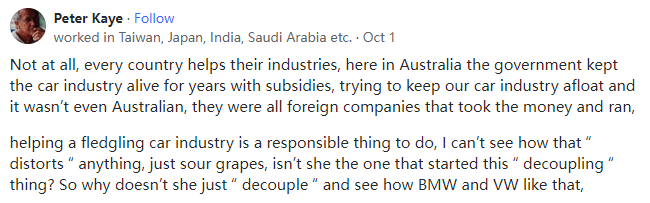 worked in Taiwan, Japan, India, Saudi Arabia etc,Lived in Curra Queensland Australia曾在台湾、日本、印度、沙特阿拉伯等地工作,曾在澳大利亚昆士兰州Curra生活完全不是这样,每个国家都会帮助本国的产业。在澳大利亚,政府多年来一直通过补贴来维持汽车产业的发展,试图让我们的汽车产业继续生存下去,而这些汽车产业甚至都不是澳大利亚的,它们都是拿了钱就跑的外国公司、