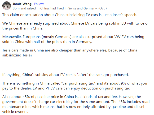Born and raised in China, had lived in Swiss and Germany关于中国补贴电动汽车的说法或指责只是失败者的言论。