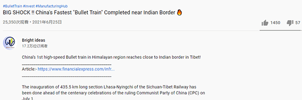 本文译自Youtube,原标题:BIG SHOCK !! China's Fastest "Bullet Train" Completed near Indian Border ���China’s 1st high-speed Bullet train in Himalayan region reaches close to Indian border in Tibet!______________________________________________Article:- https://www.financialexpress.com/infr...______________________________________________The inauguration of 435.5 km long section Lhasa-Nyingchi of the Sichuan-Tibet Railway has been done ahead of the centenary celebrations of the ruling Communist Party of China (CPC) on July 1.The inauguration of 435.5 km long section Lhasa-Nyingchi of the Sichuan-Tibet Railway has been done ahead of the centenary celebrations of the ruling Communist Party of China (CPC) on July 1, a PTI report said. On Friday morning, the electrified railway in Tibet Autonomous Region opened for the first time, linking Lhasa with Nyingchi as on the Himalayan plateau region, “Fuxing” bullet trains enter official operation. The news was reported by state-run Xinhua news agency.中国在喜马拉雅地区的第一列高速子弹头列车到达西藏靠近印度边界的地方!Article:- https://www.financialexpress.com/infr..川藏铁路拉萨至林芝段全长435.5公里,在7月1日中国共*产党成立一百周年庆祝活动之前完成了揭牌仪式。上周五上午,西藏自治区电气化铁路首次开通,连接拉萨和林芝的喜马拉雅高原地区“复兴”号动车组正式投入运营。官方媒体新华社报道了这一消息。This shows us a mirror that how truly fast they are?