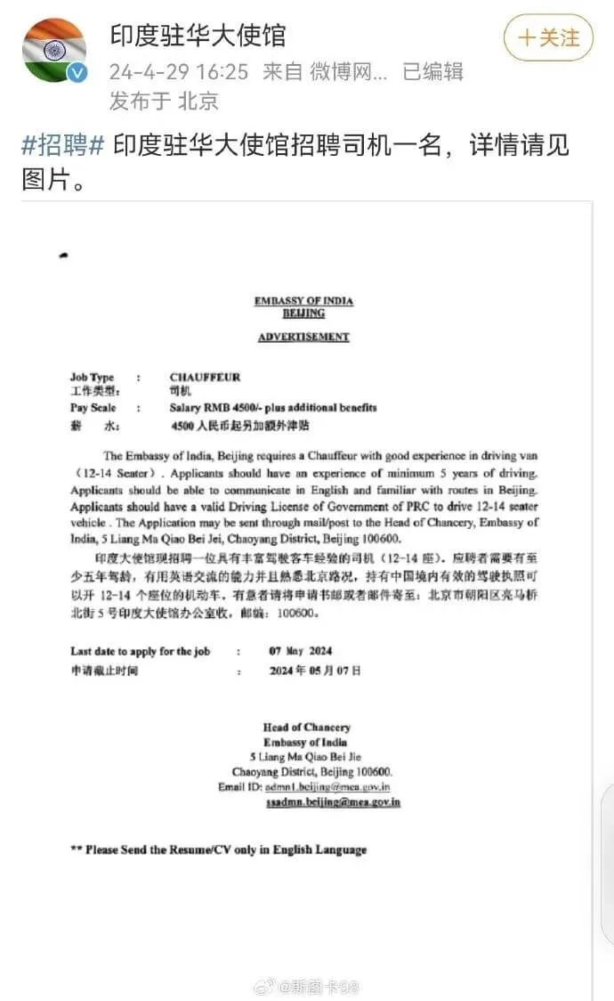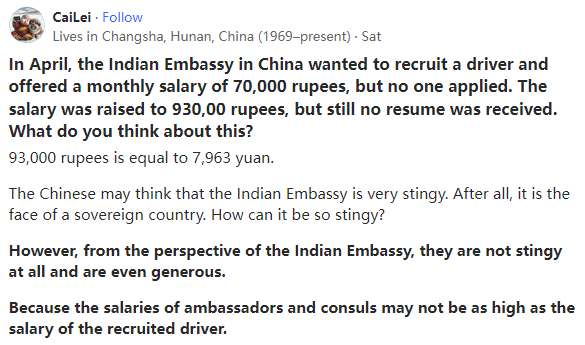 网文来自网友原文翻译投稿,所有言论皆不代表本站立场 | 本文文字/图片来自网络,侵删 | 点击页眉也可刷新 | 注册送50花瓣,每日登录送5花瓣 | 本文内容仅供娱乐,不作任何严肃之用途网友热议印度大使馆4500元招司机,还要求精通英语,无人问津后涨到7万卢比,后又涨到9.3万卢比本文译自Quora,原标题:In April, the Indian Embassy in China wanted to recruit a driver and offered a monthly salary of 70,000 rupees, but no one applied. The salary was raised to 930,00 rupees, but still no resume was received. What do you think about this?上个月月底,印度驻华大使馆发布招聘公告,招聘一名司机。要求有至少五年驾龄,同时有用英语交流的能力并且熟悉北京路况,且持有中国境内有效的驾照,可以开12-14座位的机动车,当时给出的薪资标准为4500元人民币起和额外津贴。网友认为,在北京工作并且要求还挺多,至少只有B1驾照、会英语、认识路,但工资只有4500元/月,确实太低了点,怕是没有人会应聘。有网友表示,这个价格,印度阿三那些留学生可能都会觉得不错吧。还有网友称,这个薪资水平,估计在孟买都能招到3个人了。可见印度是真的不了解中国的薪资,尤其是北京的人力成本。还有网友表示,印度人说的懂英语,但未必是说懂印度英语。时隔一个月,印度驻华大使馆终于发现,发布出去后,原来真的无人问津,随后无奈又涨了2250元。尽管印度驻华大使馆认为薪酬待遇比上次涨了两千多,已经相对优厚了,但由于其对司机的技能要求较高,尤其是需要具备流利的英语口语表达能力,因此在社交媒体上引发了大量网民的热议与调侃。Lives in Changsha, Hunan, China (1969–present)4月,印度驻华使馆想招聘一名司机,开出的月薪为7万卢比,但无人应聘。后来工资涨到了9.3万卢比,但仍然没有收到简历。您对此有何看法?中国人可能会认为印度大使馆非常小气。毕竟,这是一个主权国家的脸面,怎么能这么小气呢?然而,在印度大使馆看来,他们一点也不吝啬,甚至还很慷慨。因为印度驻华大使和领事的工资未必有招聘的司机的工资高。同样,如果中国驻欧美使馆也按照当地的工资标准招聘欧美司机,但用人民币支付大使的工资,那么欧美司机的工资也不一定比大使的工资低。印度驻华使馆招聘司机时给出的工资已经是他们能给出的最高工资了。要判断他们开出的工资是否有诚意,首先要看印度人的平均工资水平。Ø无独有偶,美国驻印度首都新德里大使馆最近也在招聘司机,美国人开出的薪水是年薪44万卢比,相当于月薪3200元人民币。Ø您可以在印度招聘网站上轻松查询印度司机的薪水。几家顶级出租车公司开出的月薪为15000至20000卢比,相当于1346至1818元人民币。Ø印度某高校的教师的月薪为1.2万至2万卢比,相当于人民币1026至1710元。Ø在印度的幼儿园,学前教师的月薪为6000至10000卢比,相当于513至855元人民币。Ø在中国,新生儿护理保姆的起薪是每月1万元,好的保姆需要2万元以上。但在印度,新生儿护理保姆也是24小时工作,给幼儿喂奶、洗澡,月薪只有1.6万至1.9万卢比,相当于1367-1624元人民币。诚意肯定是有的,不能因为月薪低就认为印度大使馆没有诚意。如果一切按照国内物价和本币购买力来计算,中国的工资水平其实已经处于世界上游。北京网约车司机的月薪也能达到8000至15000元人民币,相当于9.3万至17.6万印度卢比。许多外国人选择北京作为来中国旅行的第一站,其他省份的人也喜欢到北京旅游,所以北京的网约车生意相当不错。以93万卢比的薪水招聘懂英语的中国人来为印度驻北京大使馆当司机确实太难了。我建议印度大使馆在印度招聘会说中文的司机,然后在中国考取驾照。9.3万卢比的工资会有很多人应聘。7963元人民币的司机工资很高,但如果你希望司机能说流利的英语就不高了。要让人接受这一点,印度政府需要赞助一个精通印度语言但假装不精通印度语言的人。北京的网约车司机的月收入也能达到8000至15000元。许多外国人选择北京作为来华旅游的第一站,其他省份的人也喜欢到北京旅游,北京的网约车生意相当不错。CaiLei,也许你引用的数据在五六年前是准确的。而现在,任何一个印度一线城市的讲师或出租车司机的收入几乎肯定会远远高于你说的平均水平。这些工资的估算是基于15亿人中的9名司机。在印度,(用这个工资)你可以轻松找到1亿名司机。老兄,我笑得很开心。Ø您可以在印度招聘网站上轻松查询印度司机的薪水。几家顶级出租车公司开出的月薪为15000至20000卢比,相当于1346至1818元人民币。Ø印度某高校的教师的月薪为1.2万至2万卢比,相当于人民币1026至1710元。Ø在印度的幼儿园,学前教师的月薪为6000至10000卢比,相当于513至855元人民币。你的数据至少是7年前的。在印度,出租车司机的月薪为35000至50000卢比,大学教师的月薪在50000到2000000卢比之间,幼儿园教师的收入约为10000至15000卢比。随着经济的发展,如果这些工资在未来10年内翻一番,我也不会感到惊讶。你在做哪些白日梦?大学老师的工资从5万到20万,哇。你说的一定是年薪吧?这就好比说安巴尼每分钟赚1000万卢比,所以其他15亿印度人都是收入超高的超级富豪一样。印度高校教师的月薪确实在5万至20万卢比之间,这取决于教师的资历级别。是的,但这对资深教授来说并不多。在澳大利亚,同等级别的教师月薪为110万卢比,他们还有其他福利和与研究相关的额外任务。这