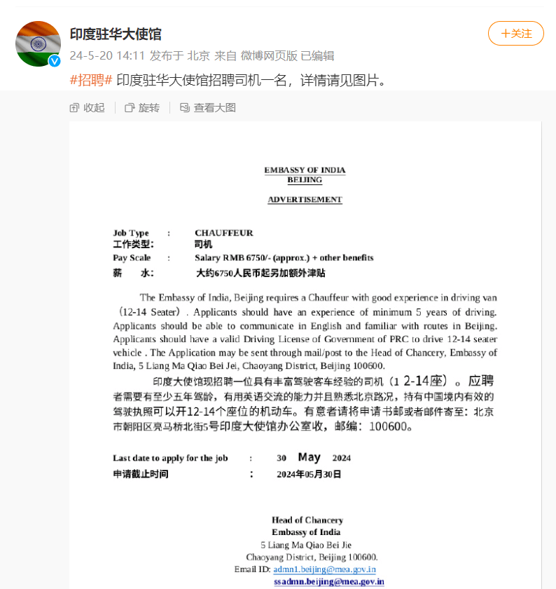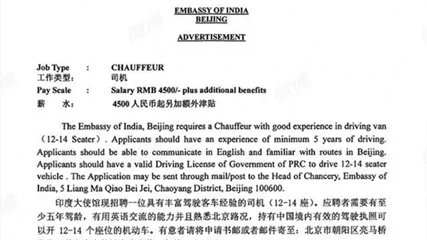 关键字:印度大使馆招司机,印度大使馆招聘司机,印度大使馆4500元招司机 专题:中印关系责任编辑:管理员
